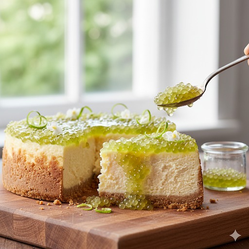 Este cheesecake é uma sobremesa elegante e refrescante, onde a acidez e a textura única do limão caviar complementam a cremosidade do cheesecake.